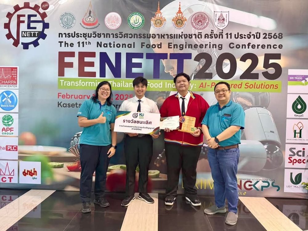 ขอแสดงความยินดีกับ นายสุรเชษฐ์ อินทร์วงษ์ และนายชวิศ น้อยวิเศษ นักศึกษาหลักสูตรวิศวกรรมเกษตรและอาหาร คณะเทคโนโลยีและการจัดการอุตสาหกรรม (FITM) มจพ. ที่สามารถคว้ารางวัลชนะเลิศ ภาคนิทัศน์ จากการประชุมวิชาการวิศวกรรมอาหารแห่งชาติ ครั้งที่ 11 (The 11th National Food Engineering Conference) ซึ่งจัดขึ้นระหว่างวันที่ 13-14 กุมภาพันธ์ 2568 ณ Sean Palm Convention Hall มหาวิทยาลัยเกษตรศาสตร์ กำแพงแสน ผลงานที่ได้รับรางวัลคือ “การออกแบบและพัฒนาเครื่องตัดซองบรรจุภัณฑ์สำหรับการรีโพรเซสผลิตภัณฑ์ซอสปรุงรส” โดยมี ผศ.ดร.จิตติมณฑน์ วงศ์ษา อาจารย์ประจำภาควิชาวิศวกรรมเกษตรเพื่ออุตสาหกรรม เป็นอาจารย์ที่ปรึกษา และได้รับคำแนะนำจาก คุณสิวพงษ์ สัจจะวัฒนวิมล บริษัท เนทีฟ ฟู้ด จำกัด . ความสำเร็จในครั้งนี้สะท้อนถึงศักยภาพของนักศึกษาในการพัฒนาเทคโนโลยีที่สามารถนำไปใช้ในภาคอุตสาหกรรมอาหารได้จริง และเป็นอีกหนึ่งความภาคภูมิใจของ FITM ในการส่งเสริมงานวิจัยและนวัตกรรมที่ตอบโจทย์อุตสาหกรรมเกษตรและอาหารของประเทศ